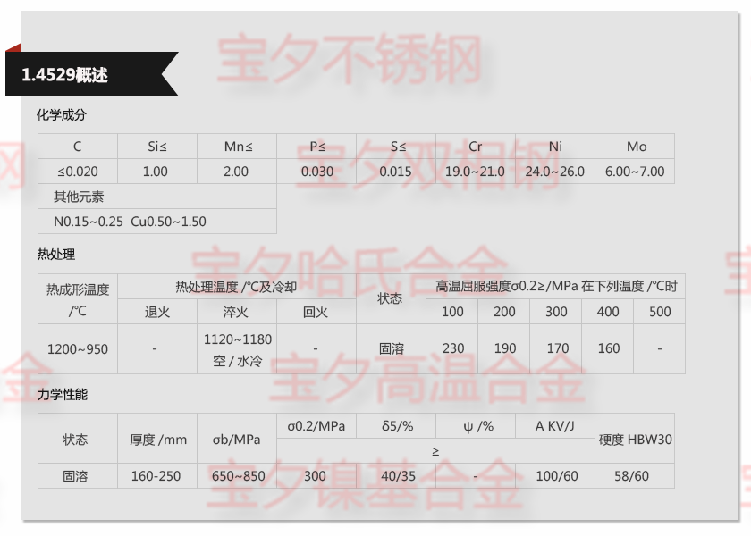 上海宝夕实业—1.4529材质单,上海宝夕实业—1.4529成分表,上海宝夕实业—1.4529是什么材料
