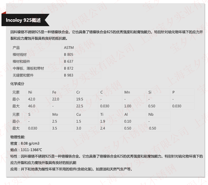 上海宝夕实业—lncoloy 925材质单,上海宝夕实业—lncoloy 925成分表,上海宝夕实业—lncoloy 925是什么材料