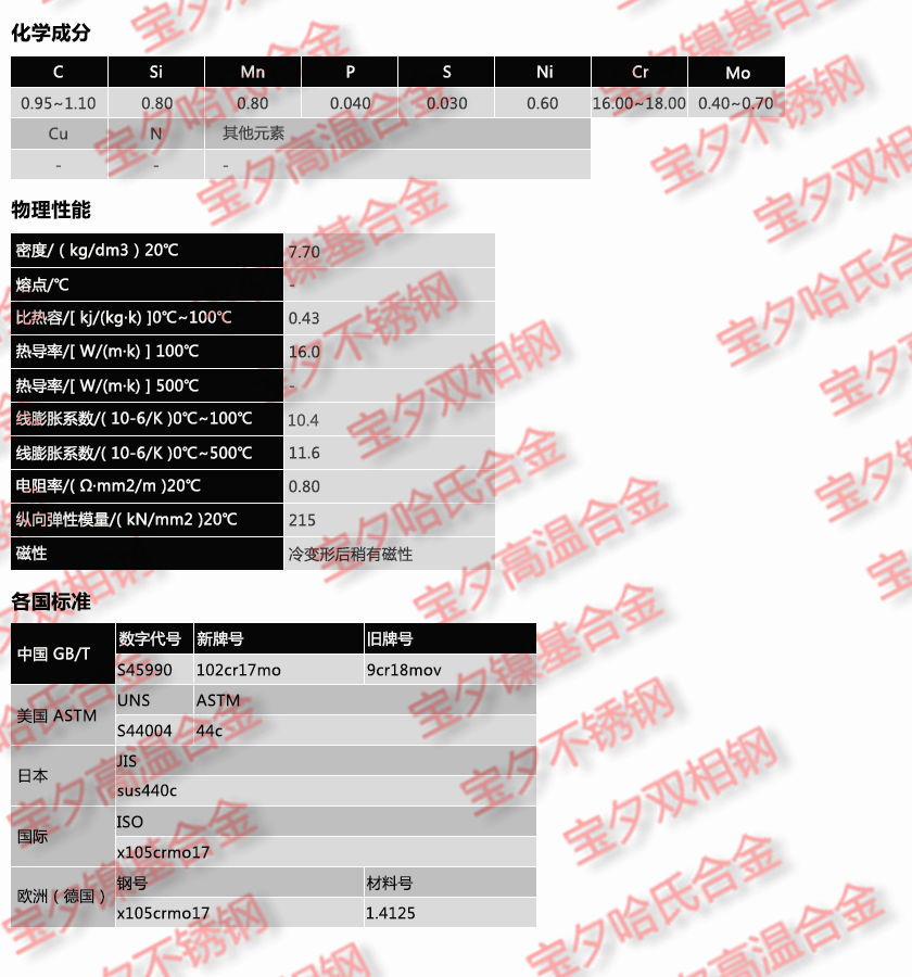宝钢102Cr17Mo,太钢102Cr17Mo,新日铁102Cr17Mo,日本冶金102Cr17Mo,蒂森克虏伯102Cr17Mo,奥托昆普102Cr17Mo,日本神户102Cr17Mo